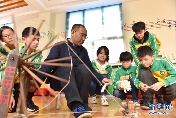 4月7日,威縣土布紡織技藝傳承人高慶海在威縣第四小學(xué)向?qū)W生講解老粗布紡織技藝。近年來,河北省邢臺市威縣積極開展“非遺傳承進(jìn)校園”活動(dòng),將當(dāng)?shù)靥厣沁z項(xiàng)目引入學(xué)校課堂,讓學(xué)生近距離感受民間傳統(tǒng)技藝的魅力,促進(jìn)非遺文化的保護(hù)和傳承。新華社記者 朱旭東 攝
