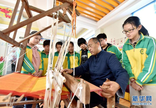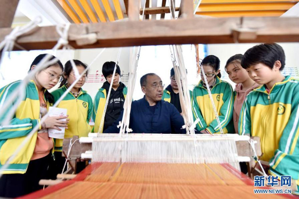 4月7日,威縣土布紡織技藝傳承人高慶海在威縣第四小學(xué)向?qū)W生演示老粗布紡織技藝。近年來,河北省邢臺市威縣積極開展“非遺傳承進(jìn)校園”活動(dòng),將當(dāng)?shù)靥厣沁z項(xiàng)目引入學(xué)校課堂,讓學(xué)生近距離感受民間傳統(tǒng)技藝的魅力,促進(jìn)非遺文化的保護(hù)和傳承。新華社記者 朱旭東 攝