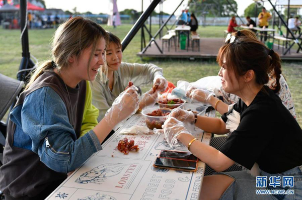 4月29日,游客在品嘗石淙清水小龍蝦。目前石淙鎮(zhèn)共有5000多畝農(nóng)田采用水稻與小龍蝦生態(tài)共養(yǎng)模式。