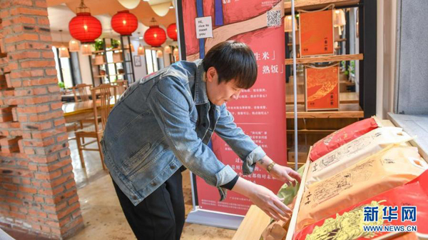 在吉林市船營區(qū)大綏河鎮(zhèn),創(chuàng)業(yè)者曹曦將農(nóng)場生產(chǎn)的大米擺在民宿顯眼位置進(jìn)行展示(4月20日攝)。