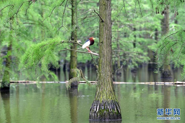 位于安徽省滁州市來安縣雷官鎮(zhèn)的池杉湖國家濕地公園經(jīng)過多年的生態(tài)修復(fù),形成分布數(shù)萬株池杉樹、具有獨(dú)特觀賞價(jià)值的“水上森林”濕地景觀,成為眾多鳥類生活、棲息的“天堂”。