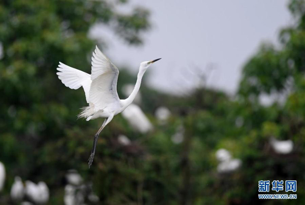 白鷺在南昌市新建區(qū)象山森林公園內飛翔(5月18日攝)。
