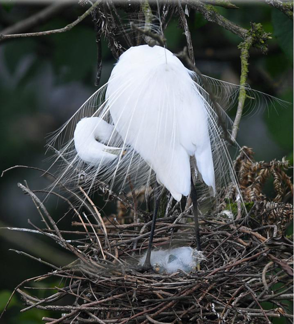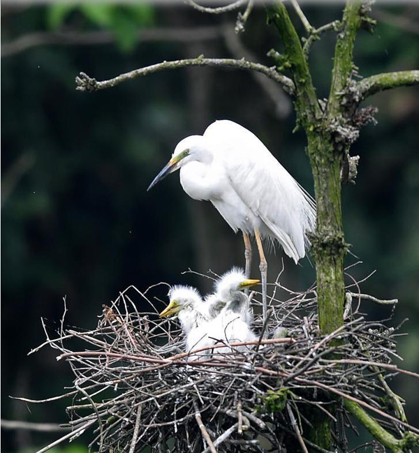 在南昌市新建區(qū)象山森林公園內,白鷺守護著雛鳥(5月18日攝)。