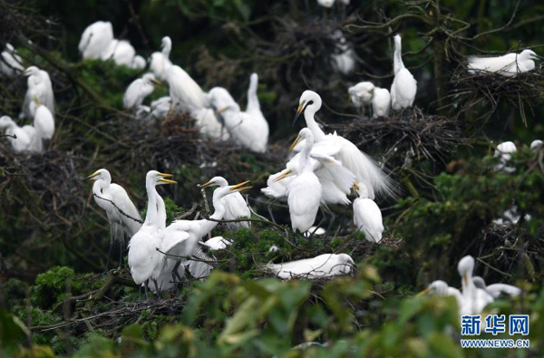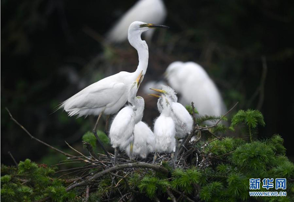 在南昌市新建區(qū)象山森林公園內,白鷺和雛鳥們在一起(5月18日攝)。