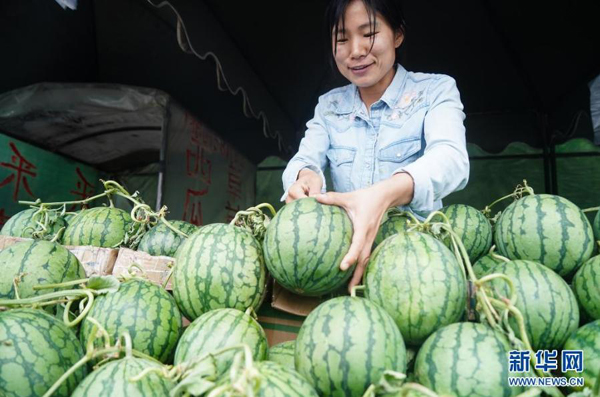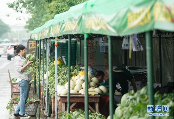 5月23日,在南京市江寧區(qū)橫溪街道,瓜農在整理攤位。