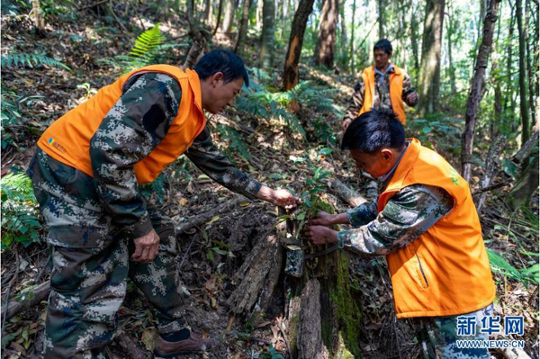 護(hù)林員楊有山(右一)和同事在布設(shè)紅外相機(jī)(3月15日攝)。