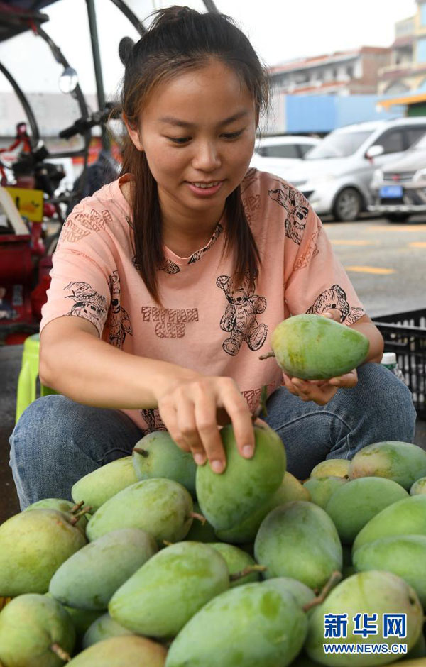 在廣西百色市田陽(yáng)區(qū)供銷合作社農(nóng)副產(chǎn)品綜合批發(fā)市場(chǎng),一名收購(gòu)商在分揀芒果(7月1日攝)。
