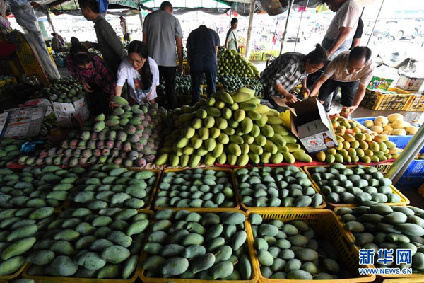 在廣西百色市田陽(yáng)區(qū)供銷合作社農(nóng)副產(chǎn)品綜合批發(fā)市場(chǎng),消費(fèi)者選購(gòu)芒果(7月1日攝)。