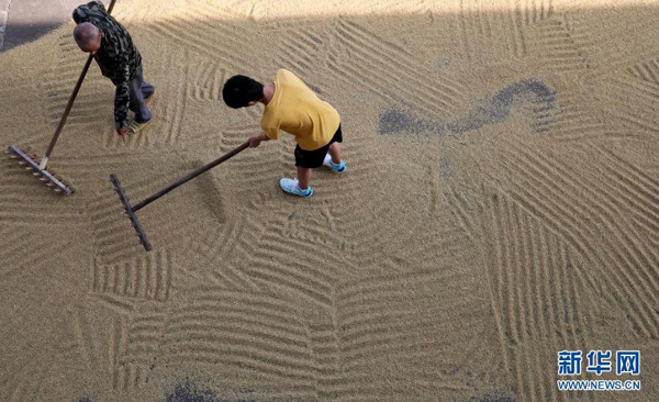 8月12日,在湖南省資興市蓼江鎮(zhèn)方榮鋪村,農(nóng)民在晾曬稻谷。