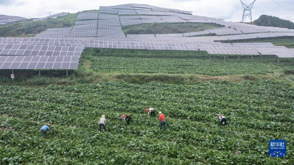 在貴州省畢節(jié)市威寧彝族回族苗族自治縣,光伏板下5000多畝土地種植的農(nóng)產(chǎn)品進入豐收季,食用菌、紅菜苔、白蘿卜……一片片光伏板下生機盎然。