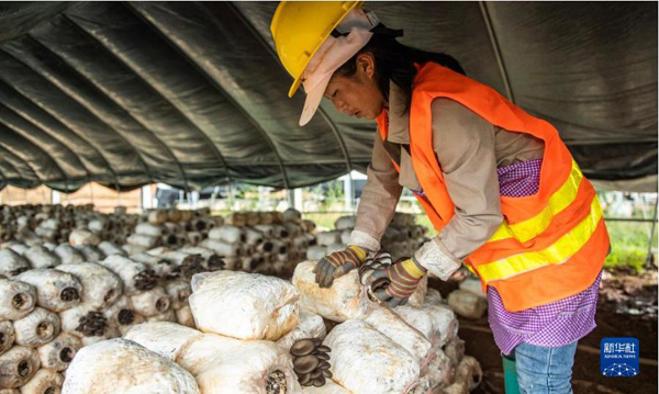 當?shù)卮迕裨谙募移鹤庸夥l(fā)電設(shè)施下的大棚內(nèi)采摘食用菌(8月24日攝)。