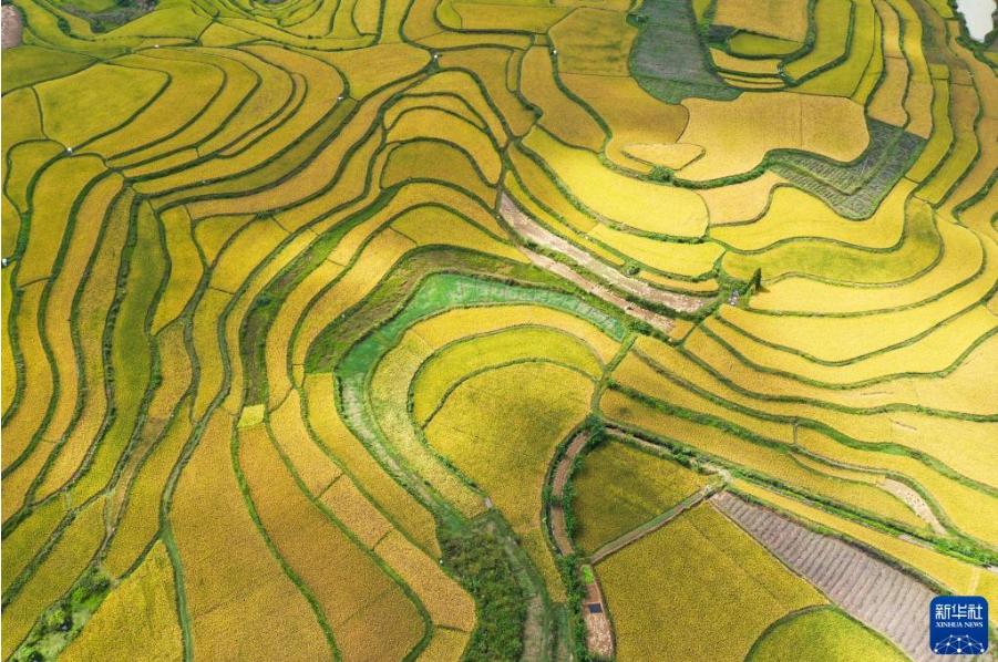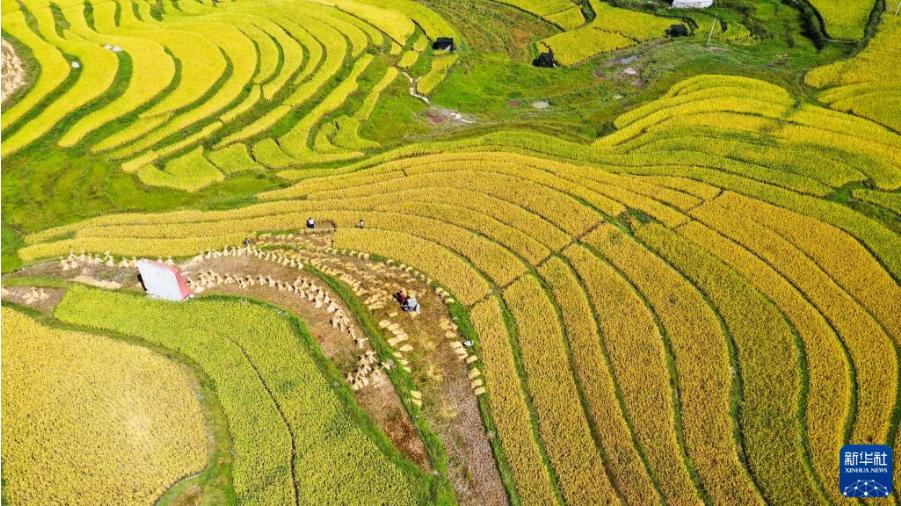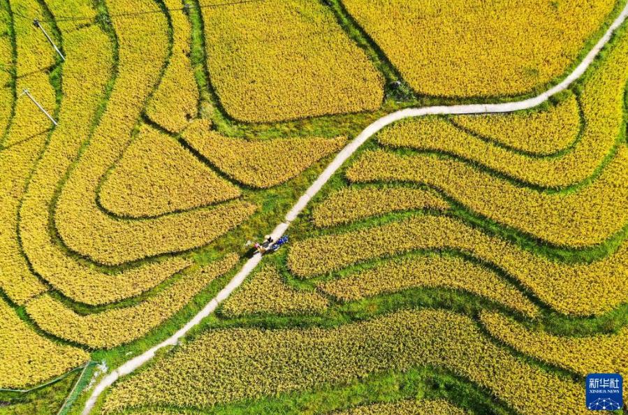 連日來(lái),貴州省黔南布依族苗族自治州龍里縣灣灘河鎮(zhèn)天氣晴好。水稻成熟,田野鍍金,農(nóng)民搶收稻谷,一片豐收景象。