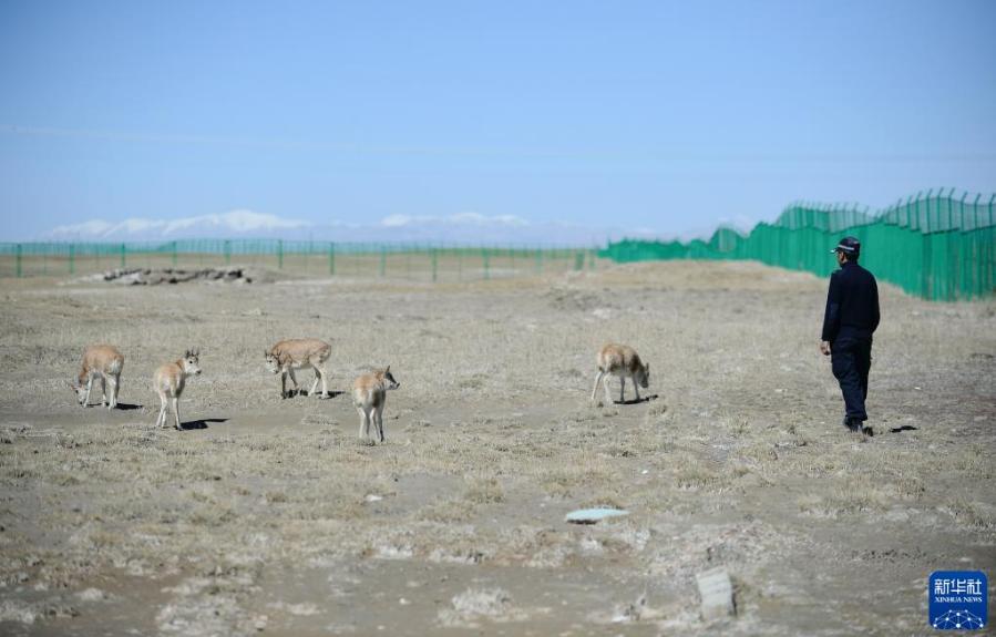 在可可西里國家級自然保護(hù)區(qū)索南達(dá)杰保護(hù)站,幾只藏羚羊在野生動(dòng)物救助中心活動(dòng)(9月28日攝)。