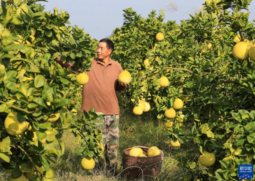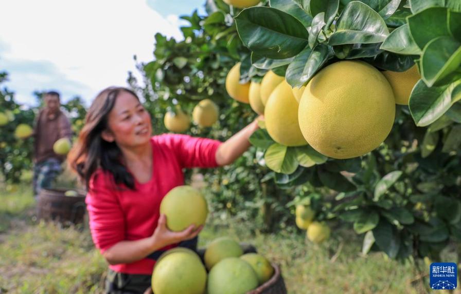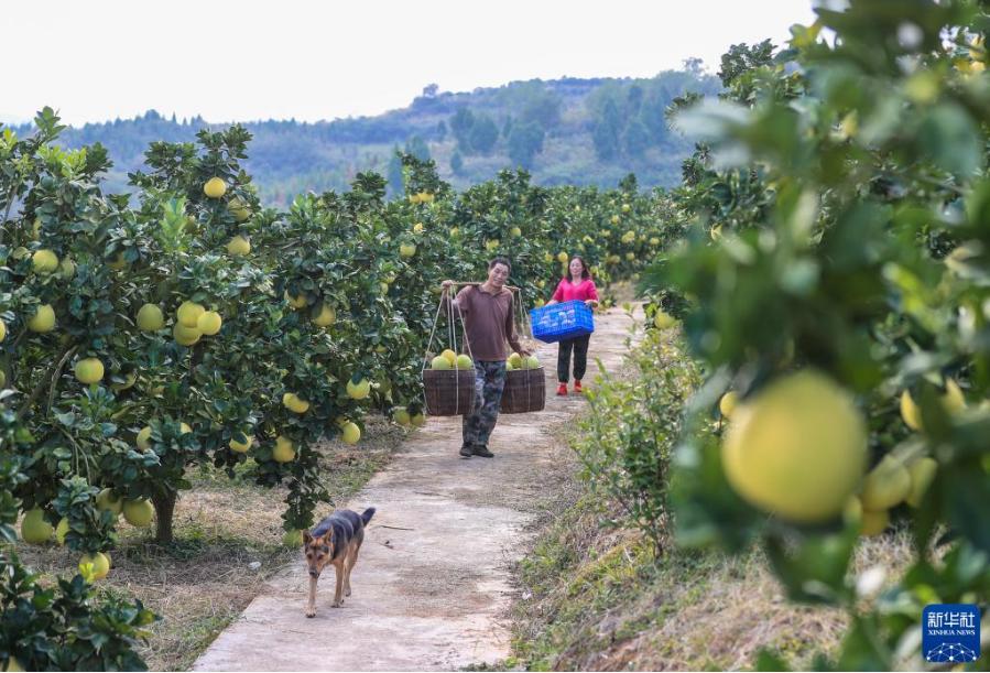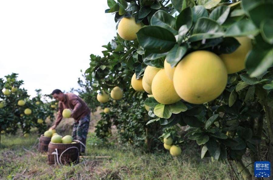 金秋時節(jié),貴州省銅仁市玉屏侗族自治縣種植的柚子迎來豐收,當?shù)卮迕褡ゾo采摘、分揀、挑運柚子,供應(yīng)市場。近年來,玉屏侗族自治縣依托當?shù)厣鷳B(tài)資源優(yōu)勢,采取“公司+合作社+農(nóng)戶”模式,引導(dǎo)農(nóng)民種植柚子,帶動農(nóng)民增收。