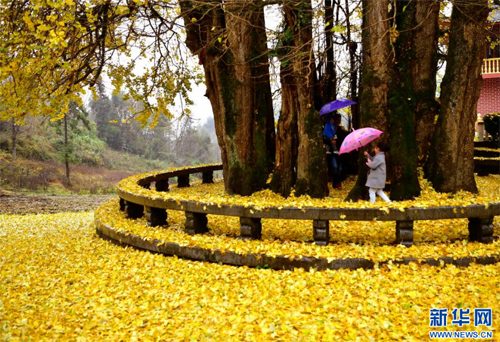 初冬時節(jié),銀杏樹葉變黃,落葉猶如給地面鋪上了一層“黃金毯”,吸引游人觀賞。 新華社發(fā)(宋文攝)