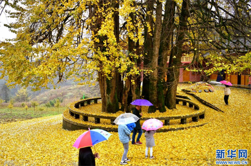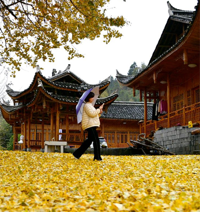 11月8日,游人在湖北省宣恩縣珠山鎮(zhèn)東門關村農家院落前的古銀杏樹下游玩。