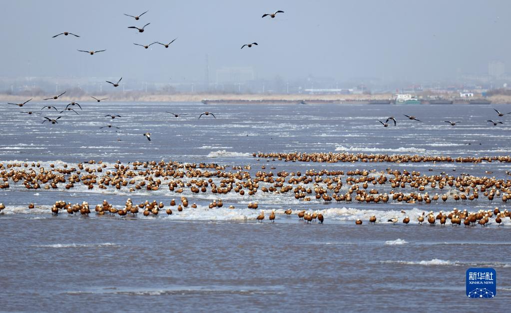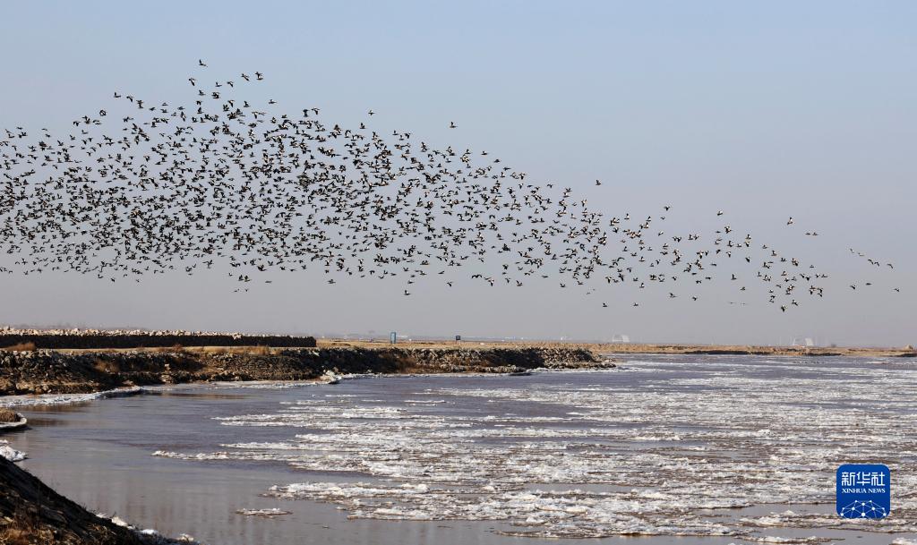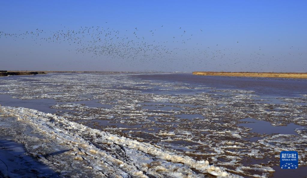 近日,受較強(qiáng)冷空氣影響,黃河“幾”字彎內(nèi)蒙古段出現(xiàn)流凌。大批南遷的候鳥或在空中翱翔,或在剛剛封凍的冰面上棲息,場(chǎng)面壯觀。