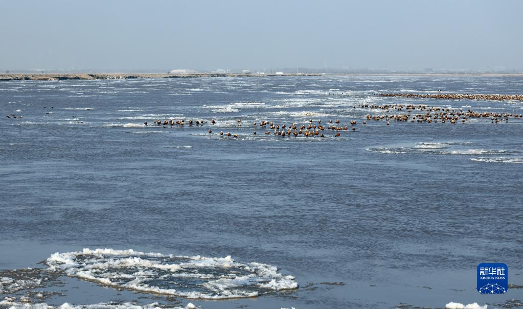 11月27日,在內(nèi)蒙古鄂爾多斯市達(dá)拉特旗,成群的候鳥棲息在剛剛封凍的冰面上。
