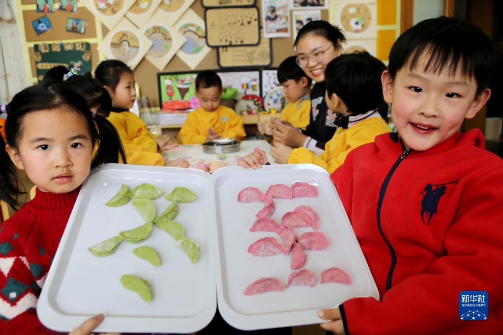 12月20日,在江蘇連云港核電鐘聲國際幼兒園,小朋友展示包好的彩色餃子。