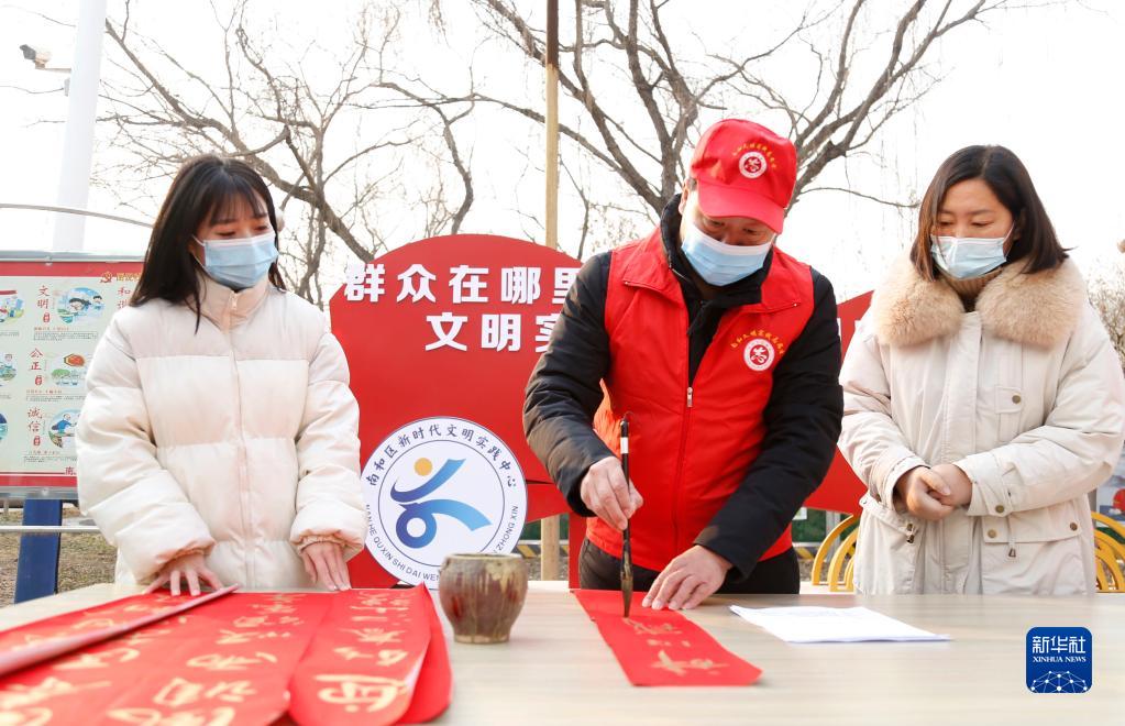 1月19日,在河北省邢臺(tái)市南和區(qū)新時(shí)代文明實(shí)踐中心,黨員志愿者為居民書(shū)寫(xiě)春聯(lián)。