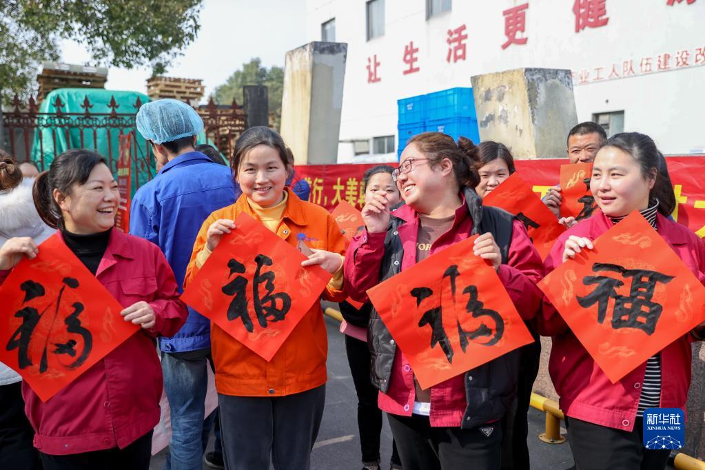 1月19日,在浙江省湖州市德清縣一塑料制品企業(yè),員工展示當(dāng)?shù)毓?huì)送來(lái)的福字。