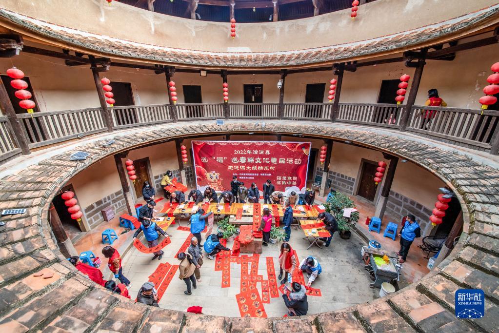 1月18日,在福建省漳浦縣錦東村錦江樓內(nèi),書(shū)法愛(ài)好者為居民寫(xiě)春聯(lián)。