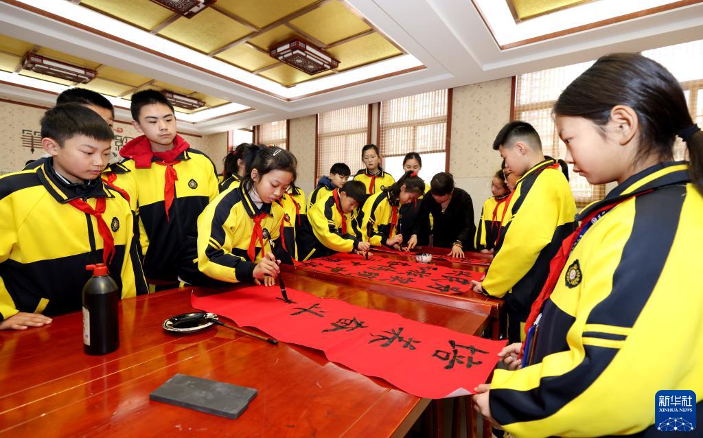 2月17日,在山東省棗莊市東湖小學,愛好書法的學生向同學們展示在寒假期間學到的書法技藝。