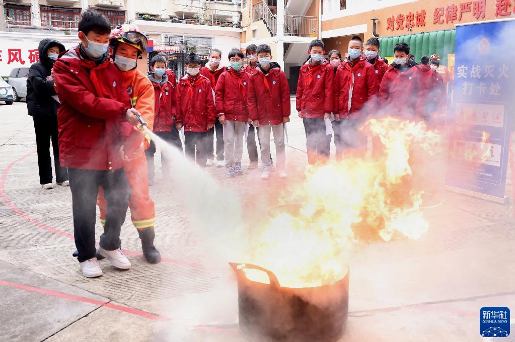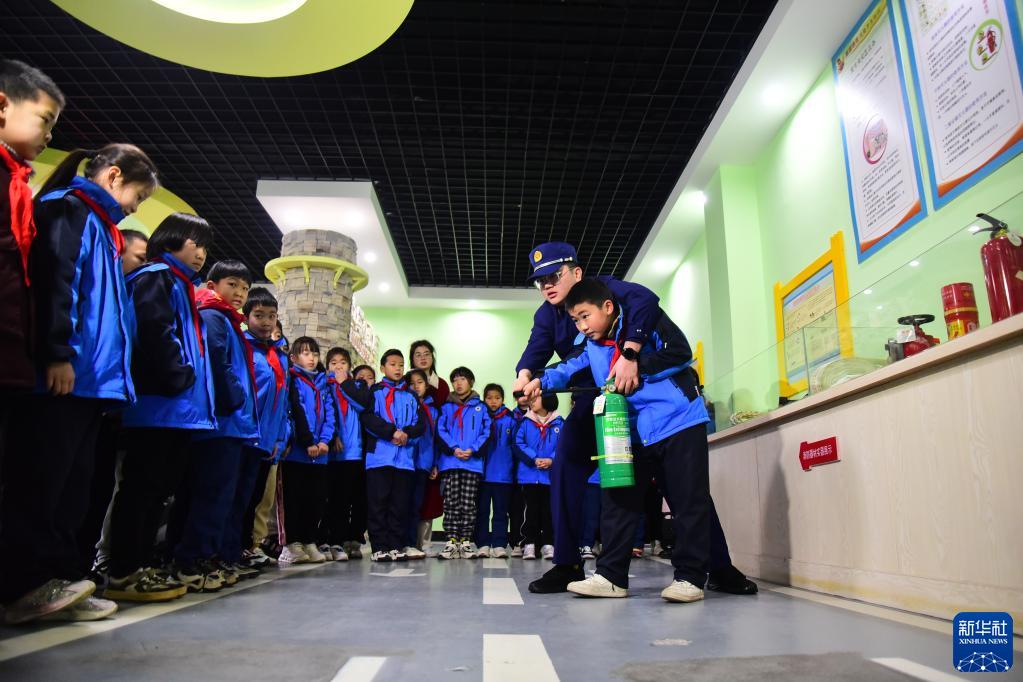 2月17日,浙江省建德市壽昌第一小學開展“安全教育 牢記于心”為主題的開學第一課消防安全知識教育活動。這是消防員在消防科普體驗館里向?qū)W生講解如何正確使用滅火器。