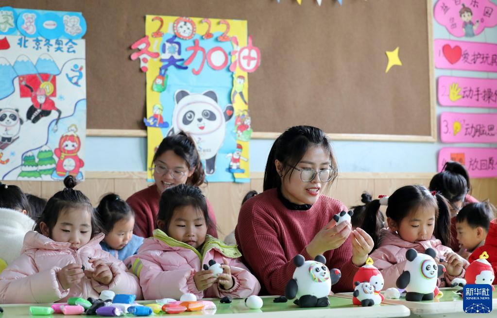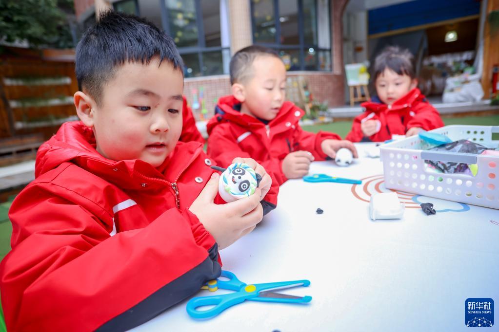 2月17日,四川省遂寧市順城街幼兒園開展“萌娃慶冬奧 我來捏冰墩墩”開學第一課主題活動。
