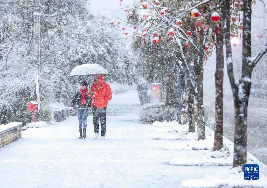 2月22日,在貴州省黔東南苗族侗族自治州丹寨縣,市民冒雪出行。