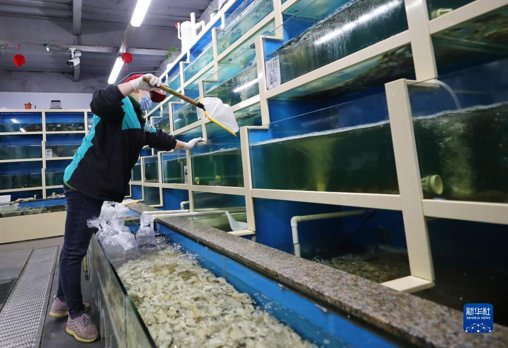 3月15日深夜,在位于上海閔行區(qū)老滬閔路的一家網(wǎng)絡(luò)購物平臺(tái)倉配站點(diǎn),工作人員在鮮活水產(chǎn)品缸前清理水中雜物。