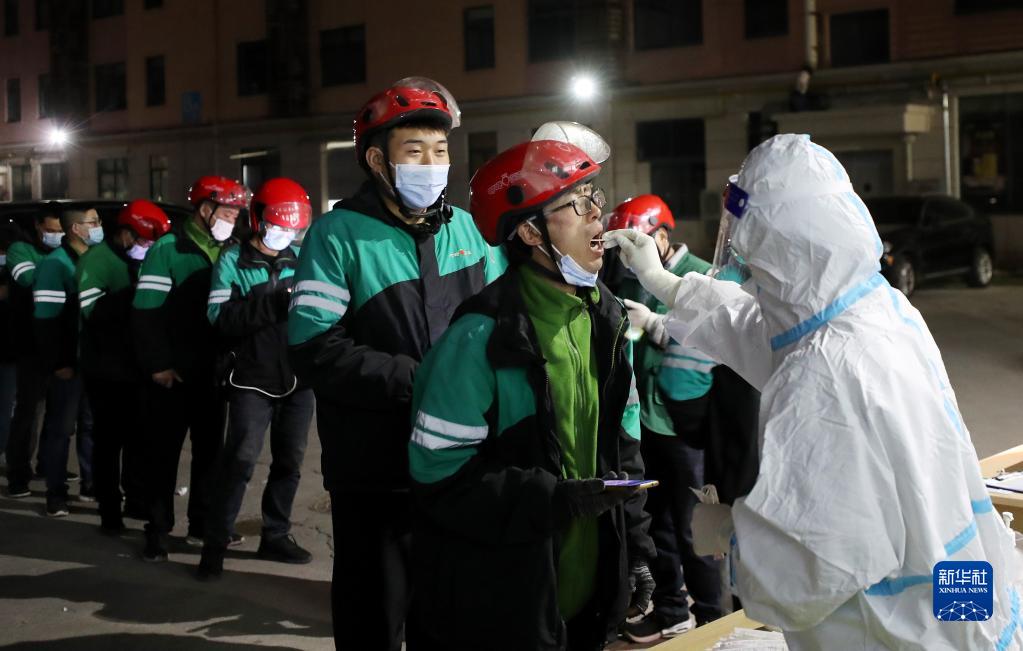 3月15日,在位于上海閔行區(qū)的一家網(wǎng)絡(luò)購物平臺(tái)倉配站點(diǎn)外,結(jié)束一天工作的配送騎手在進(jìn)行核酸檢測(cè)。