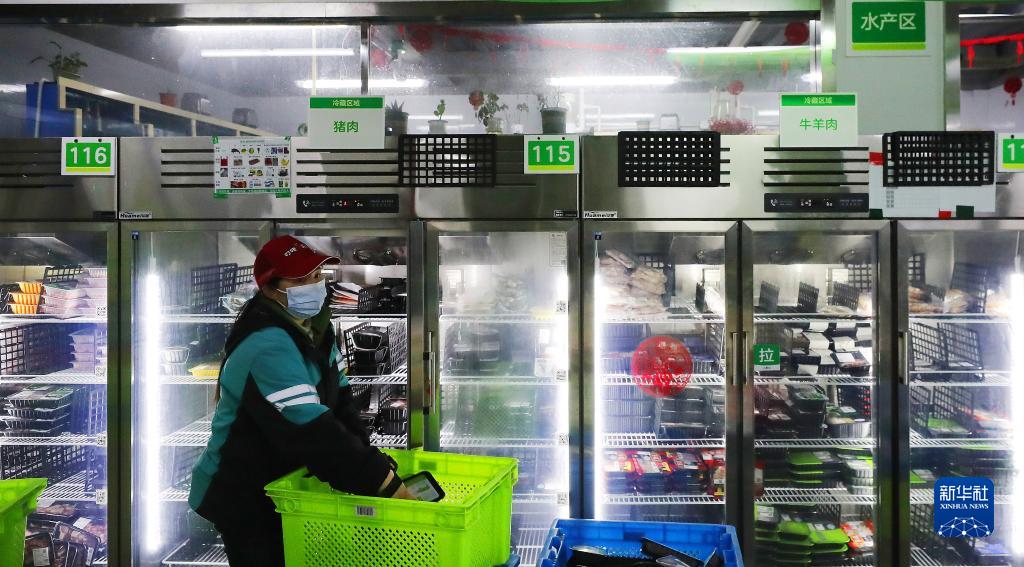 3月15日深夜,在位于上海閔行區(qū)老滬閔路的一家網(wǎng)絡(luò)購物平臺(tái)倉配站點(diǎn),工作人員將一批生鮮肉制品放入冷藏柜。