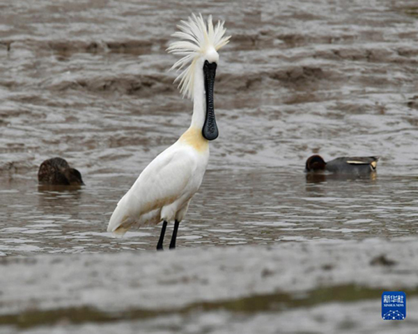 在閩江河口濕地,國家一級保護動物黑臉琵鷺在濕地里覓食(3月29日攝)。