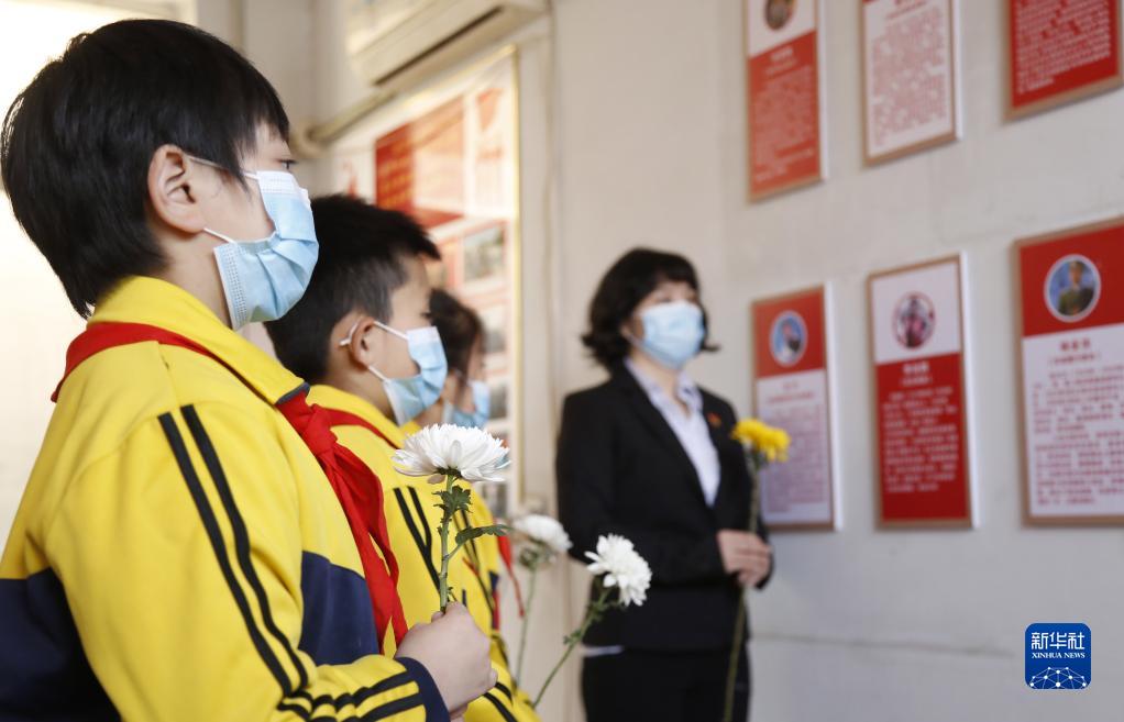 4月4日,在河北省邢臺(tái)市襄都區(qū)東郭村鎮(zhèn)北陳村社區(qū)英烈事跡館,學(xué)生敬獻(xiàn)鮮花緬懷先烈。