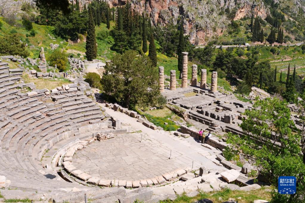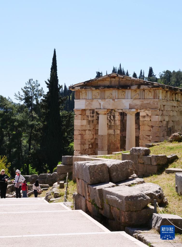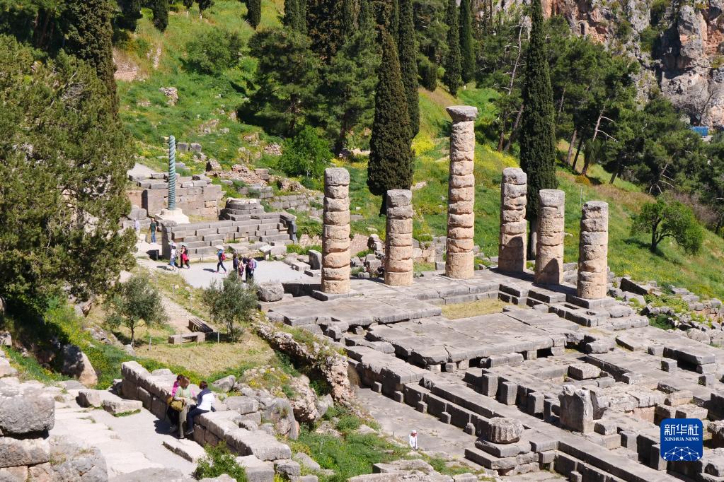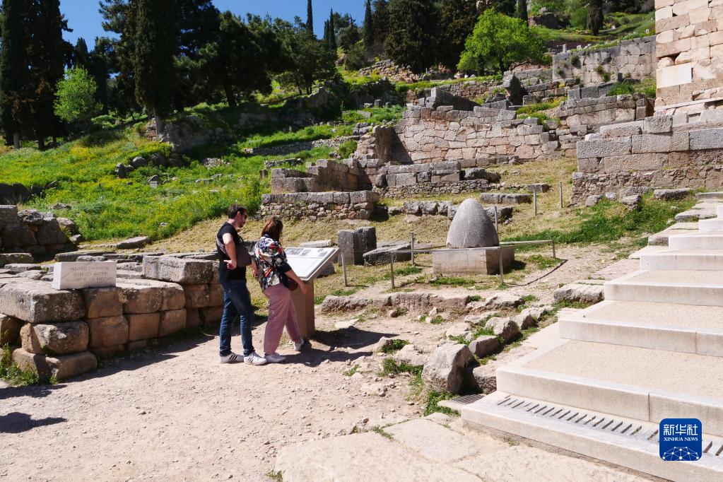 4月8日,在希臘中部德?tīng)栰车貐^(qū),游客在德?tīng)栰晨脊胚z址游覽。