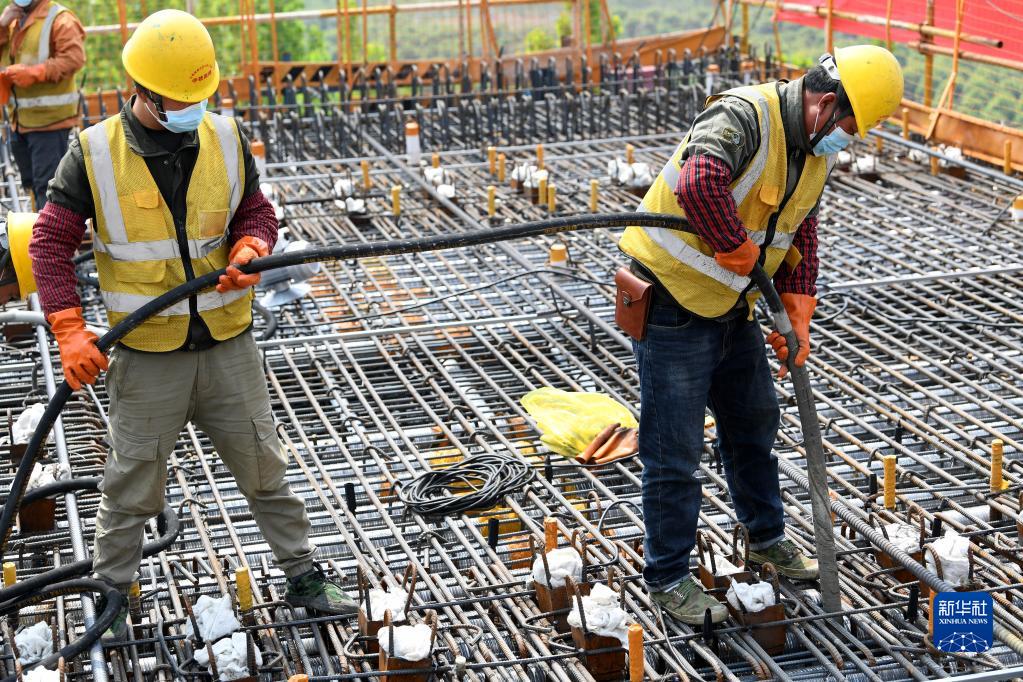 4月19日,施工人員在澆筑現(xiàn)場作業(yè)。
