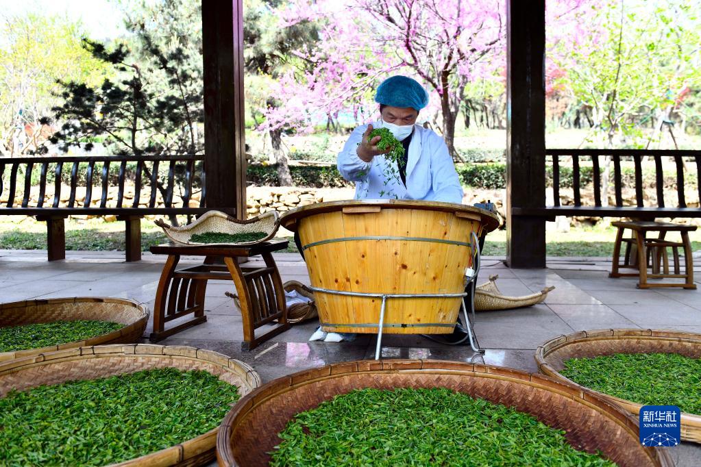 4月22日,在日照市嵐山區(qū)碧波茶葉基地,茶農(nóng)在炒制春茶。