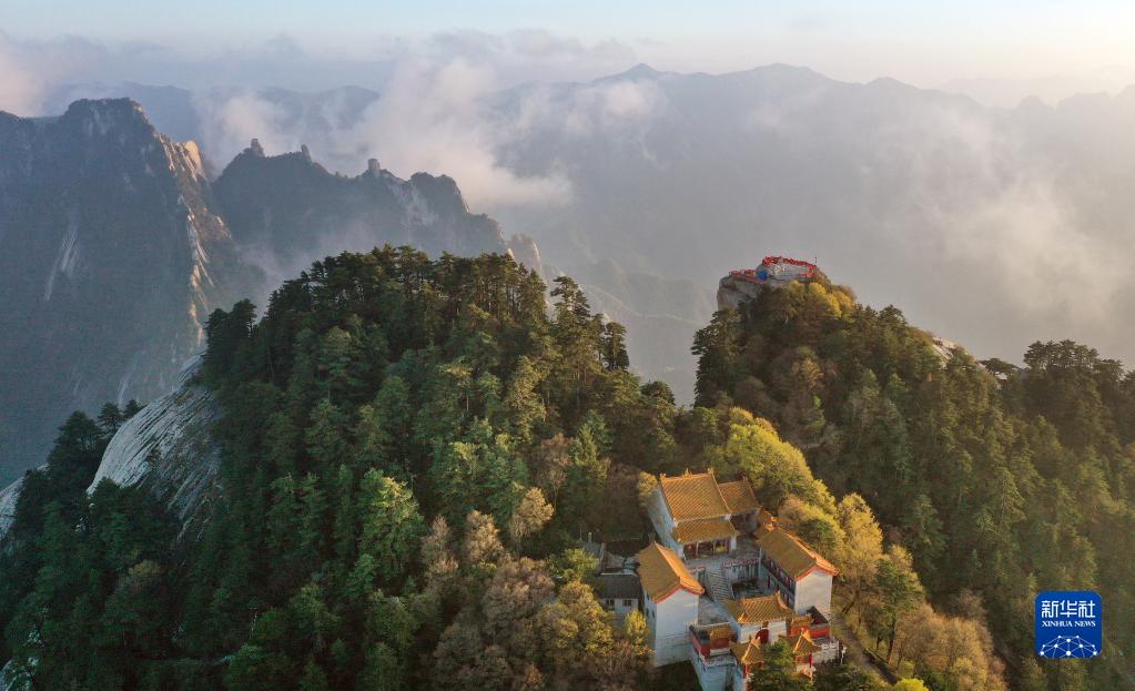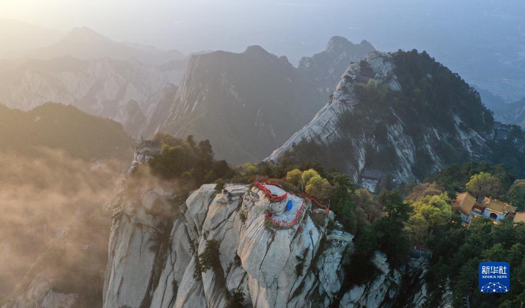 夕陽下的華山南峰(4月28日攝,無人機照片)。