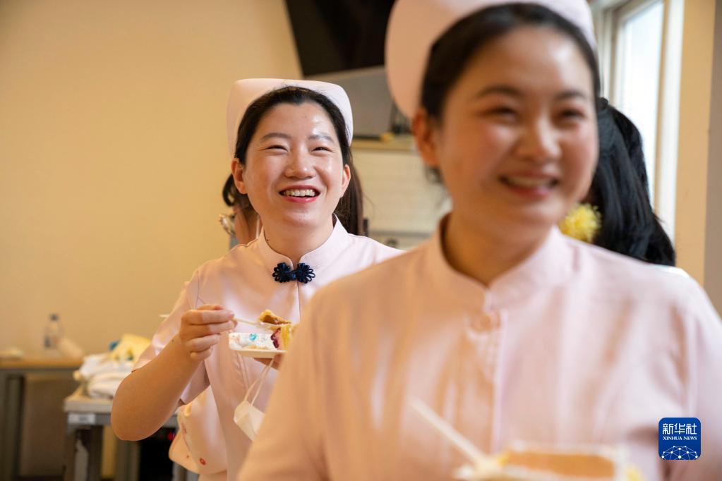 5月11日,在北京按摩醫(yī)院舉行的國(guó)際護(hù)士節(jié)慶?;顒?dòng)上,醫(yī)護(hù)人員吃蛋糕。