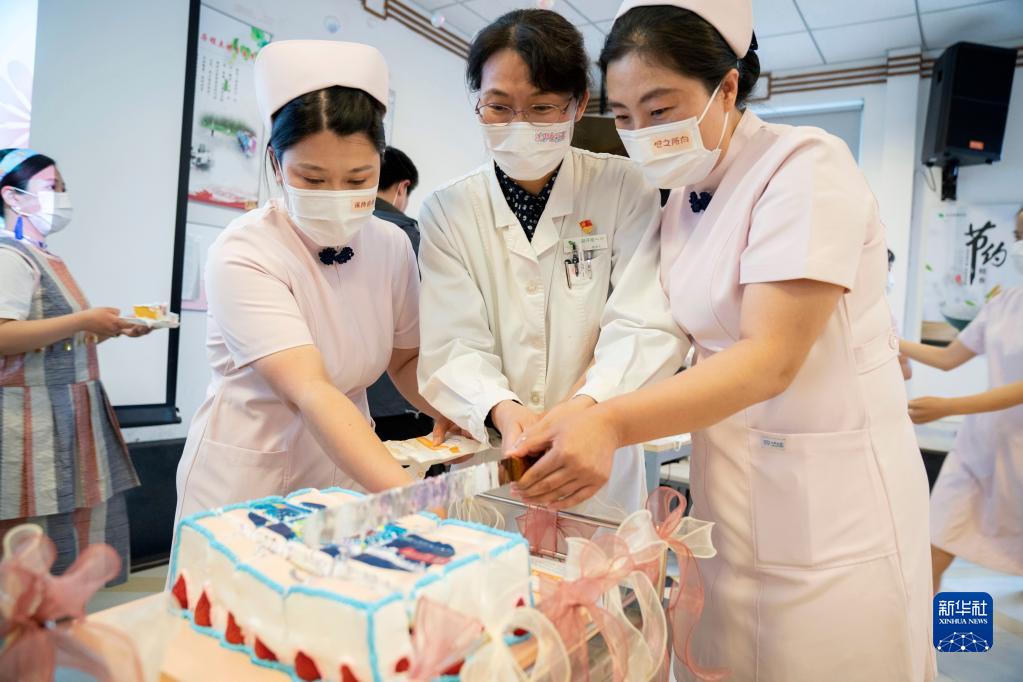 5月11日,在北京按摩醫(yī)院舉行的國(guó)際護(hù)士節(jié)慶?;顒?dòng)上,醫(yī)護(hù)人員切蛋糕。