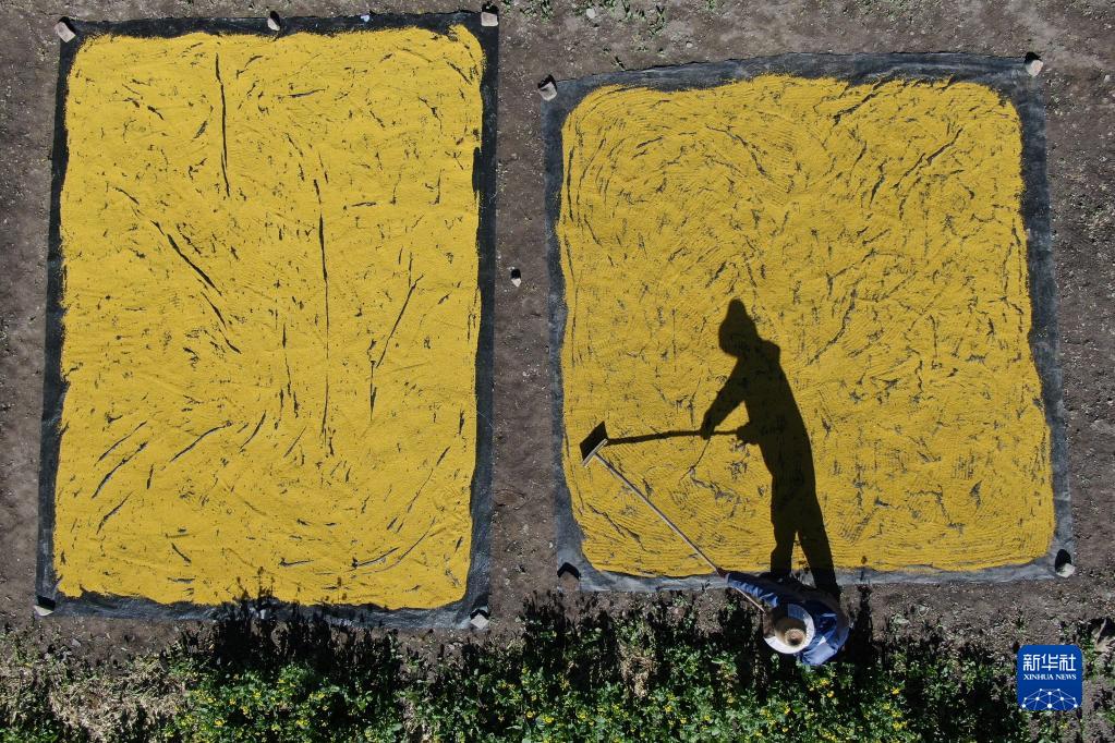 7月3日,在青海省海北藏族自治州門源回族自治縣,馮躍宣在晾曬花粉(無人機(jī)照片)。