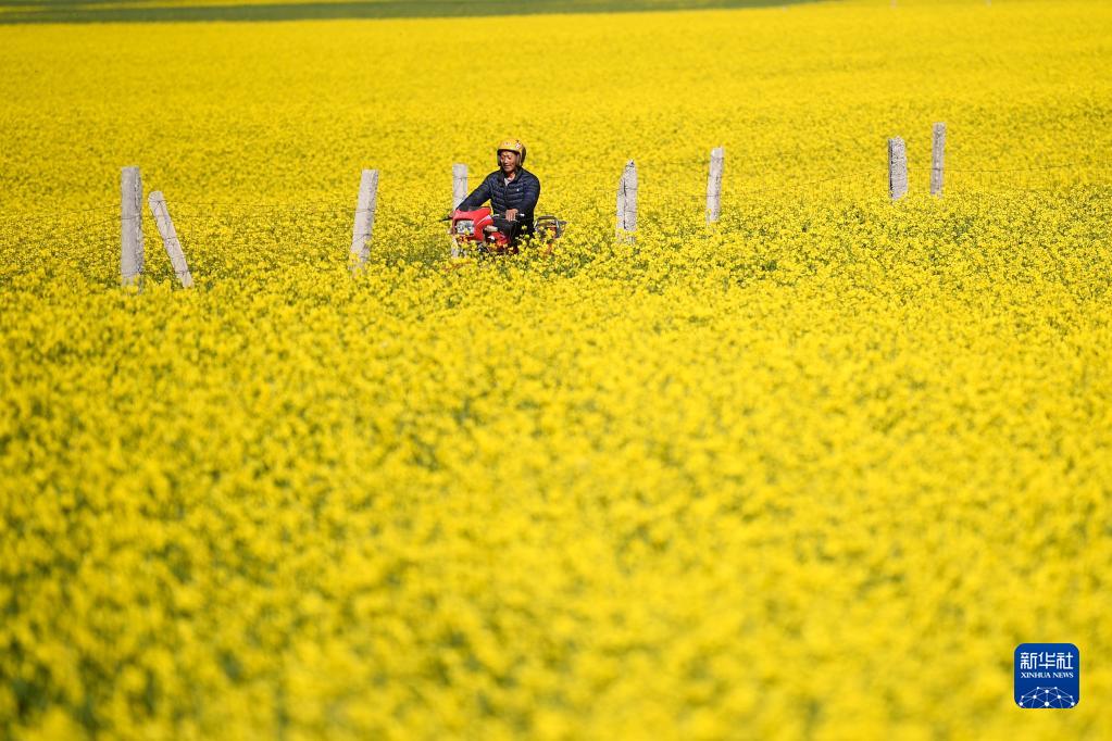 進(jìn)入七月,位于青海省海北藏族自治州門源回族自治縣的萬畝油菜花競(jìng)相綻放。來自四川德陽的蜂農(nóng)馮躍宣在花海里忙碌。他從早上7點(diǎn)開始整理蜂箱、采集花粉、晾曬花粉,一直忙碌到晚上8點(diǎn)。