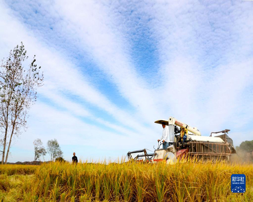 10月10日,在湖南省衡陽市祁東縣河洲鎮(zhèn),農(nóng)機(jī)手駕駛農(nóng)機(jī)在收割稻谷。