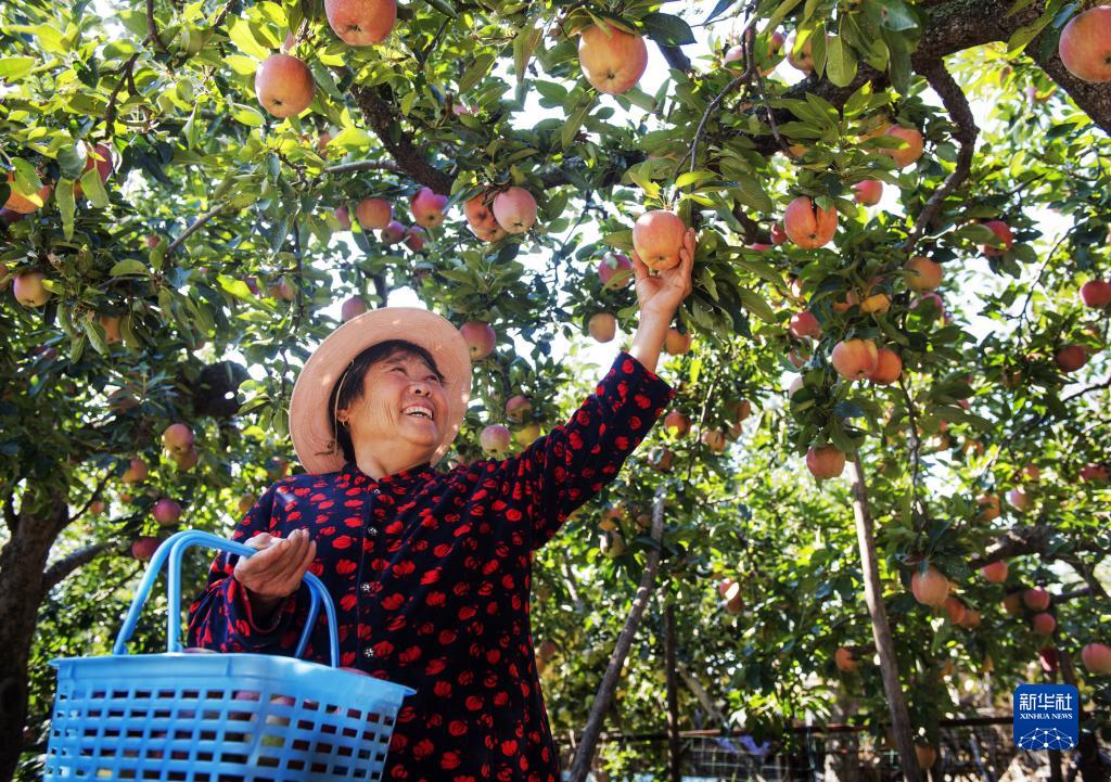 10月8日,山東省膠州市洋河鎮(zhèn)曲家爐村的村民在果園里采收蘋果。