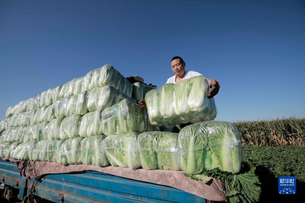 10月10日,河北省玉田縣虹橋鎮(zhèn)的農(nóng)民將收獲的白菜裝車外運(yùn)。