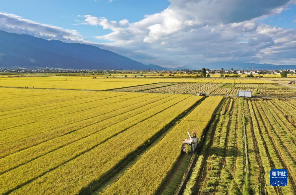 10月8日,在云南省大理白族自治州大理市灣橋鎮(zhèn),農(nóng)機(jī)手在收獲水稻(無人機(jī)照片)。