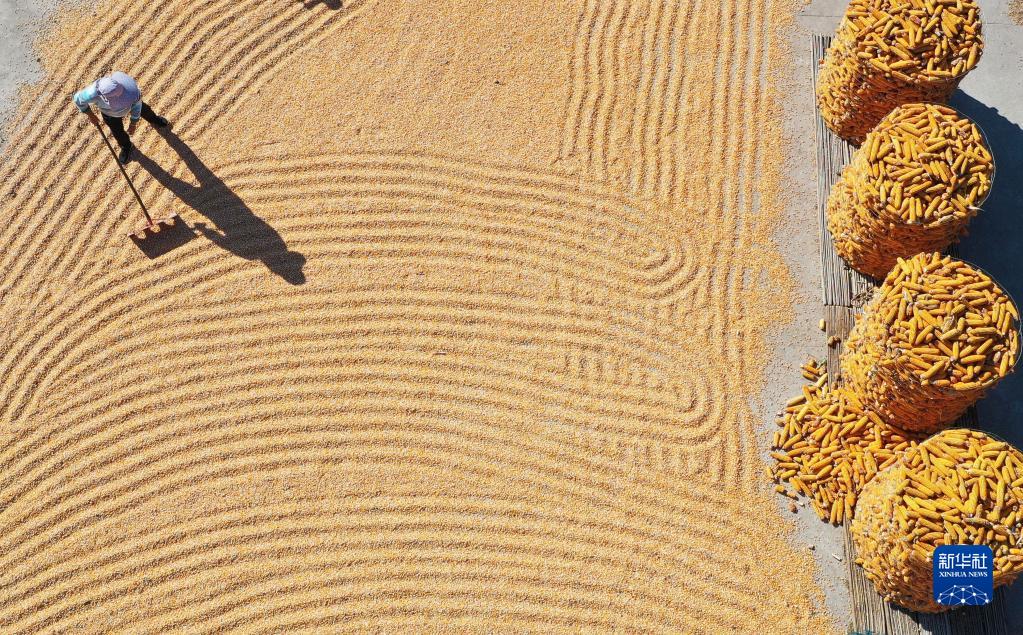 10月10日,山東省臨沂市郯城縣郯城街道農(nóng)民在晾曬收獲的玉米(無人機(jī)照片)。