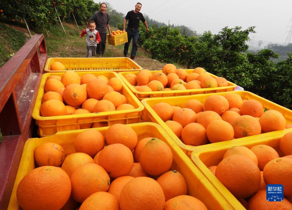 11月7日,四川省達(dá)州市高新區(qū)金埡鎮(zhèn)金山村,果農(nóng)在搬運(yùn)剛采摘的有機(jī)臍橙。