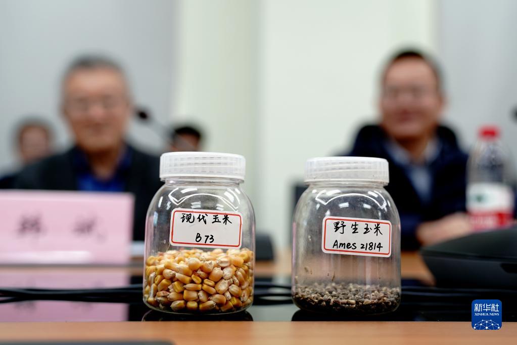 11月16日在中國科學(xué)院分子植物科學(xué)卓越創(chuàng)新中心拍攝的野生玉米種子和現(xiàn)代玉米種子。